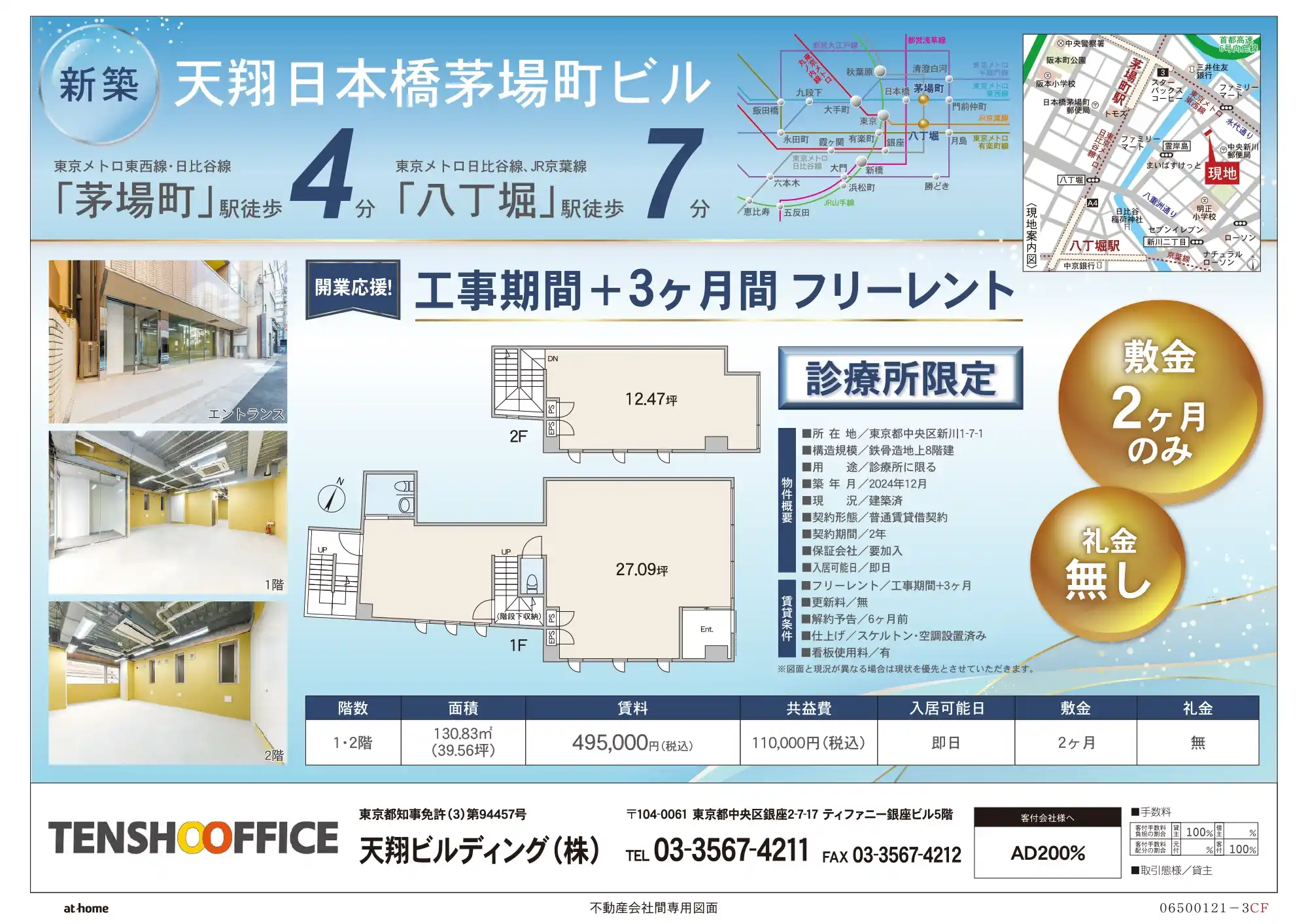 天翔日本橋茅場町ビルは、東京メトロ「茅場町駅」から徒歩4分、JR「八丁堀駅」からも徒歩圏内という好立地です。通勤途中の会社員や、同じビルで働くオフィスワーカーの利用も見込めるため、開業当初から集患しやすい環境が整っています。